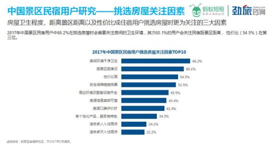 《报告》显示,2017年中国在线度假国内游用户个人月收入在8000元以上占比36.9%,家庭月收入20000元以上占比32.0%,整体用户收入处于中高水平。在此基础上,价格已经不是选择非标住宿产品的决定因素,高端舒适的非标住宿体验仍具有较大的市场空间。这一点在2017年中国景区民宿用户挑选房屋关注要素TOP10中,也有着更直观的体现。排在前三位的要素中,房间环境干净卫生(66.2%)、到景区距离近(60.1%),较性价比高至少超出5个百分点。
