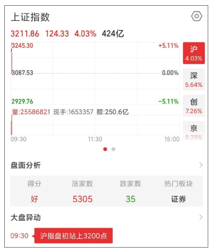 据新闻晨报综合,9月30日开盘,A股三大股指高开,沪指高开3.47%,成指高开 4.58%,创业板指高开 5.77%。数秒钟后,沪指冲上3200点。全市场超5000只股上涨,各板块普涨。