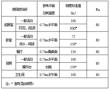 1) 足够的照度[3] 住宅各房间的照明用光多种多样,如阅读、写作、烹调、洗漱等要求较高照度,听音乐、看电视要求较低照度,对应的照度水平应使人感到各种不同活动下能轻松自如。