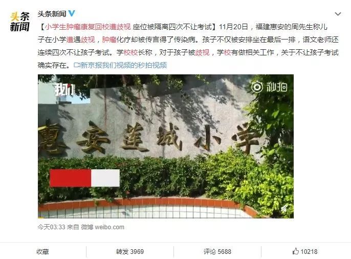 福建泉州惠安人周雄鹰在朋友圈发文,直指刚刚患病康复的的儿子小周在惠安县净峰镇莲城小学遭遇歧视——不仅座位被隔离在教室最后面,语文老师更是百般刁难,先是不让儿子进班级念书,更是连续三次不让儿子参加考试。(《法制日报》)