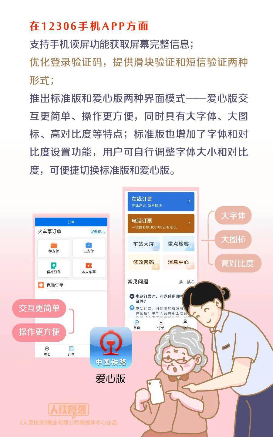 在铁路12306网站和手机APP研发投用适老化无障碍功能,是中国国家铁路集团有限公司贯彻落实中央部署要求,切实解决老年人及障碍人士运用智能技术困难的具体举措,也是在党史学习教育中开展“我为群众办实事”实践活动的工作成果。据统计,目前在铁路12306网站注册的65岁以上用户有2500万人,实施适老化及无障碍功能改造,将有效解决老年人和障碍人士在网络购票中遇到的实际问题,帮助他们更好地适应并融入智慧社会,进一步提升购票体验。同时,铁路部门还保留了现金购票、人工服务等线下渠道,加强重点旅客预约服务,为老年人及障碍人士购票出行提供便利。(人民铁道网)