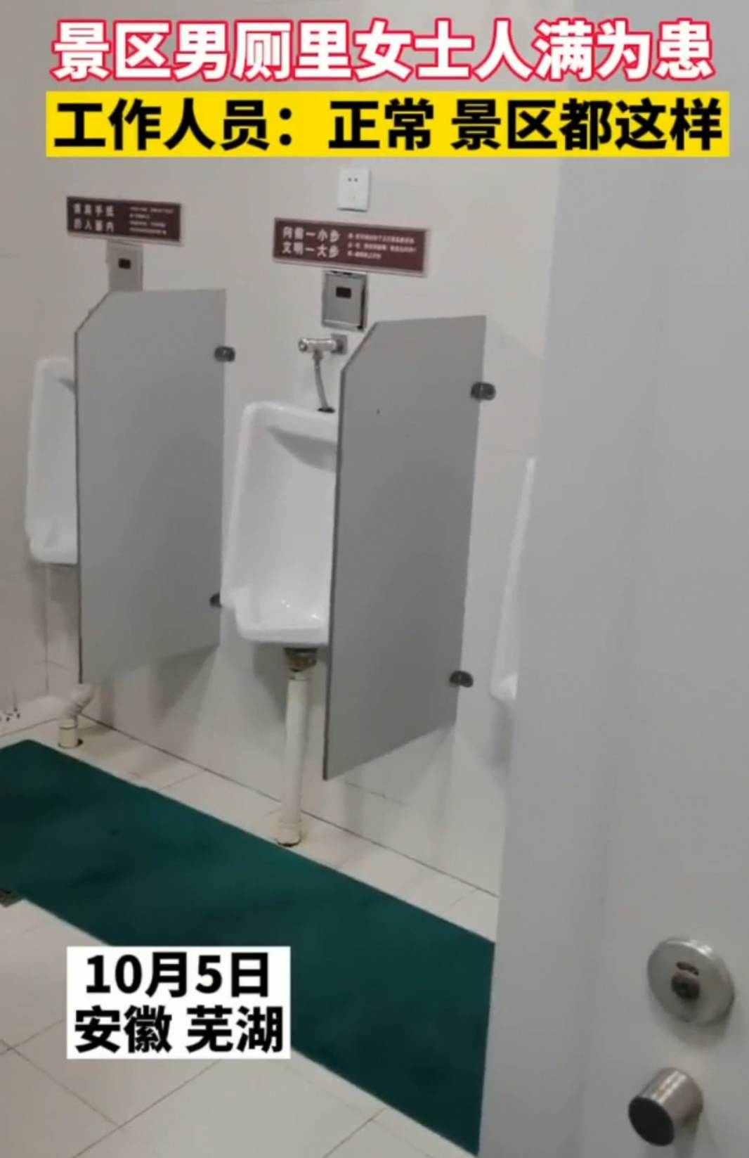 10月5日,安徽芜湖有网友爆料某景区男厕全是女士。6日,该景区工作人员回应称,因为游客太多,到哪里都是排队,也是正常现象。(2021年10月6日九派新闻)