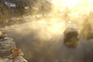当我到了温泉池跟前时,几个男男女女的泳友已经在泡温泉,他们说,游过了,又是你一个人的专场,估计不会有人来了。我和朋友们开玩笑,那就借你们的吉言,让我在雪花飘飞中享受一次个人专场。于是,大家说,那是一定的。我说,谢谢!