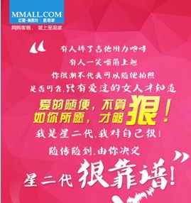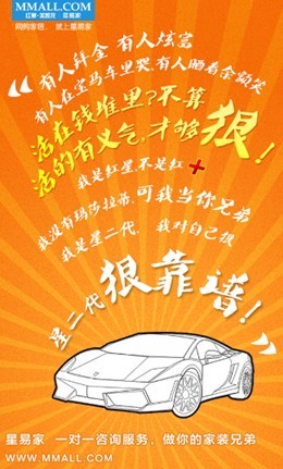 相比近期铺天盖地的双十一促销内容,星易家发布的“靠谱星二代”系列海报颇具意味。“有人拼爹,有人斗狠;有人12点上班,有人3点下班;有人追逐潮流,有人玩得嚣张”在调侃中彰显了星易家“活的张扬不算狠;选择靠谱才够狠”的品牌态度,更展现了星易家作为一个电商平台,不是只会依附拥有几十年品牌口碑的红星美凯龙的“星二代”,而是一个对自己严格要求的“靠谱星二代”。