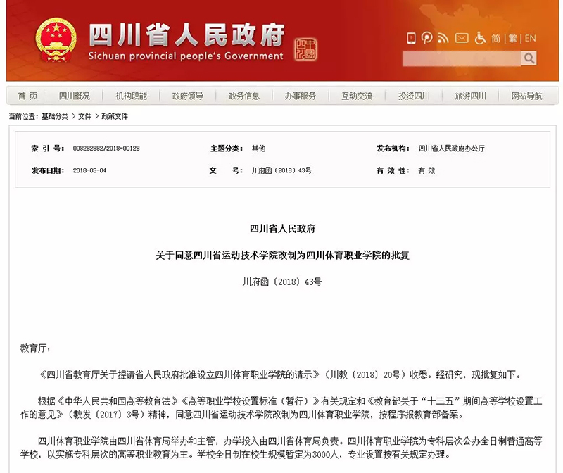 根据《中华人民共和国高等教育法》《高等职业学校设置标准(暂行)》有关规定和《教育部关于“十三五”期间高等学校设置工作的意见》(教发〔2017〕3号)精神,同意四川省运动技术学院改制为四川体育职业学院,按程序报教育部备案。