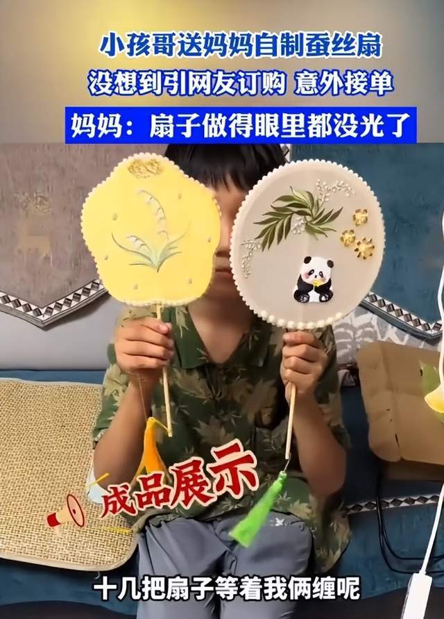近日,陕西。暑假期间,儿子亲手缠了一把蚕丝扇送给妈妈。没想到,被妈妈“嘚瑟”到网上后,竟然引得不少人前来订购......妈妈:我儿子正在努力加班中,手快抡冒烟了!