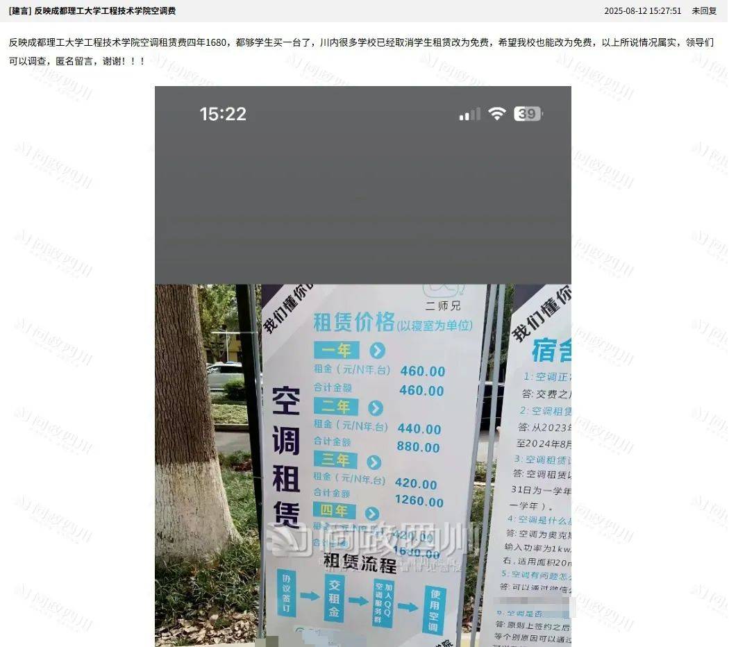 8月12日,网友反映,成都理工大学工程技术学院学生宿舍收取空调租赁费,学生要交费才能使用空调,单个宿舍四年一共要交1680元,够买一台空调的了。川内很多其他高校学生用空调是免费的,希望学校也能免费。