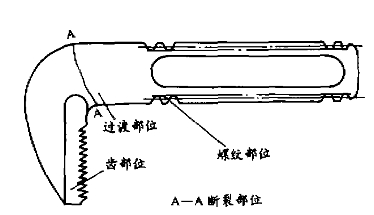 其次,进行硬度检测。管子钳活动的各个部位的硬度测试结果平均为50到60HRC,此管子钳用来拧紧或者拆卸管制以及阀门等,而进行热处理,其技术规定时齿部的硬度应当是47到50以上,而螺纹硬度应当是30到40。所以由此可以了解到,这两个不相同规格的管子钳,不管是螺纹还是齿部,硬度都高于相关技术规范。所以,管子钳出现活动钳口断裂失效的情况,见图1。