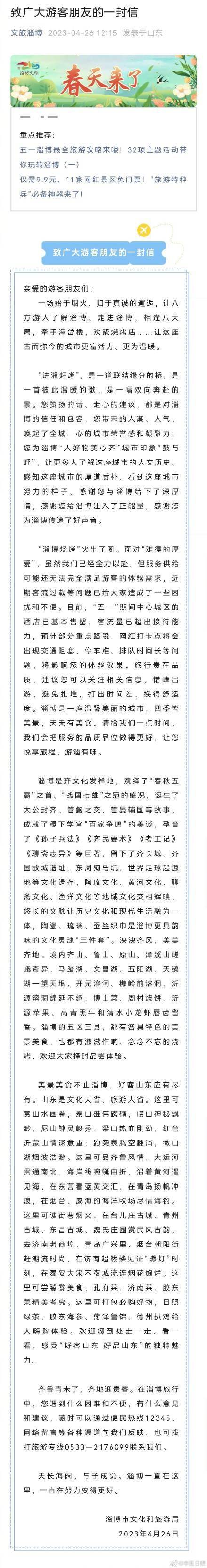 4月26日,山东淄博发布致游客朋友的一封信,提醒#淄博五一客流量超出接待能力#,建议游客错峰出游,打出时间差、换得舒适度。还称“美景美食不止淄博,好客山东应有尽有”,欢迎来鲁游客到处走一走、看一看,感受“好客山东 好品山东”的独特魅力。