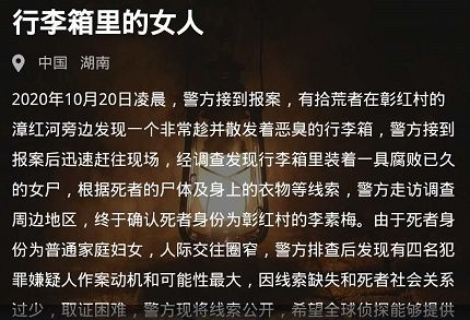 2020年10月20日凌晨,警方接到报案,有拾荒者在彰红村的漳红河旁边发现一个非常趁并散发着恶臭的行李箱,警方接到报案后迅速赶往现场,经调查发现行李箱里装着一具腐败已久的女尸,根据死者的尸体及身上的衣物等线索,警方走访调查周边地区,终于确认死者身份为彰红村的李素梅。由于死者身份为普通家庭妇女,人际交往圈窄,警方排查后发现有四名犯罪嫌疑人作案动机和可能性最大,因线索缺失和死者社会关系过少,取证困难,警方现将线索公开,希望全球侦探能够提供相关证据或推论……