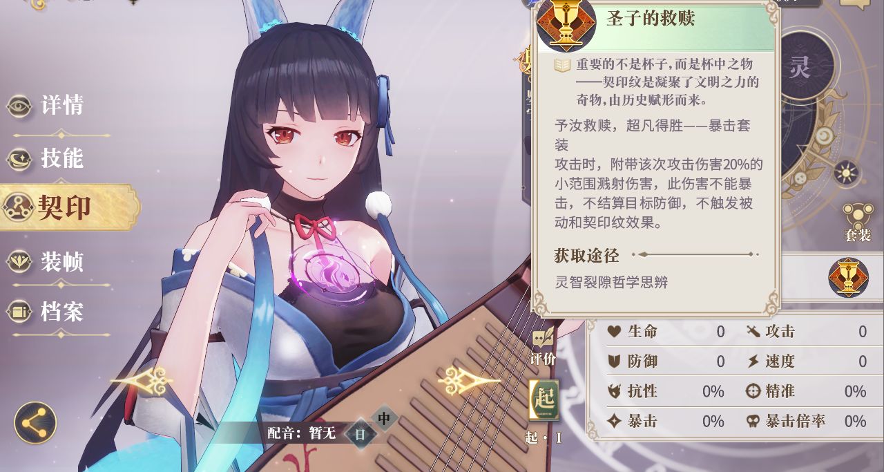 婴宁的是3保1核心大C,因为独特的输出机制,需要很多的工具人队友进行配合,才能打出超高爆发。但婴宁的书界范围较小,除了工具人队友负责聚怪外,我还推荐带上这个契印纹。圣子的救赎可以造成一个溅射伤害,溅射伤害为本体伤害的百分之20,因为婴宁的伤害极高,这百分之20的溅射伤害所带来的收益也是非常可观的。