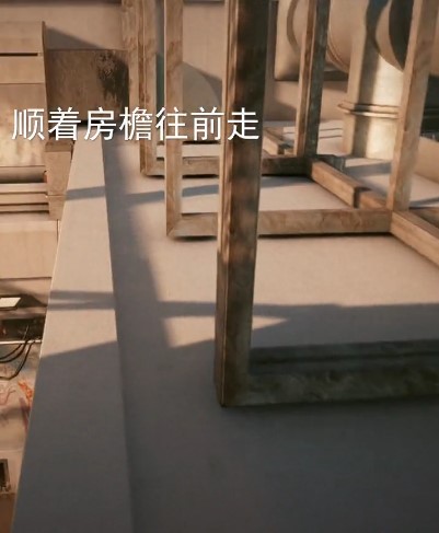 3、二段跳上去之后镜头向左,然后顺着房檐向前走,走到尽头。