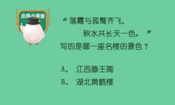 原标题:落霞与孤鹜齐飞秋水共长天一色=写的是哪一座名楼的景色 蚂蚁庄园4月28日答案最新