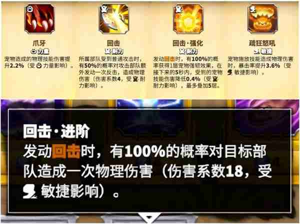 为了进一步增强反击能力和宠物输出,建议选择以下技能: “回击”、“回击·进阶”、“回击·强化”、“爪牙”、“疏狂怒吼”。这些技能可在部队受到普通攻击时触发额外效果,并提升宠物的攻击伤害和暴击率。