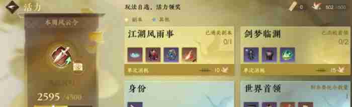 活力系统包含每周任务,如武林风雨事、剑梦临渊和世界首领等,奖励包含装备和高品质道具。建议玩家每周完成,提升角色实力。