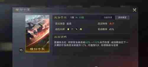 战法类型: 追击战法效果: 普通攻击后,对敌军全体造成谋略伤害,并有一定概率(受智力影响)额外发动一次攻击。每次发动伤害系数递增。
