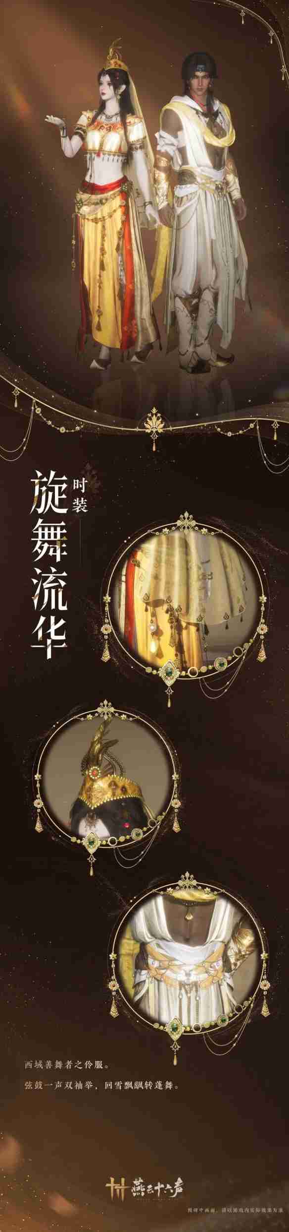 套装设计灵感源于西域风情,原画中展现了弦鼓、飞舞的衣袖等元素,诗句“弦鼓一声双袖举,回雪飘飖转蓬舞”更突显了舞蹈的灵动之美。部分玩家认为其设计风格与《舞花间》6R时装相似,尤其体现在女装部分。