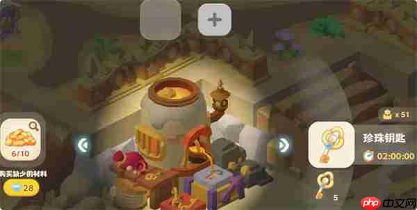 进入黄金宝窟后,可用体力兑换珍珠钥匙,每把需消耗450体力;另外映月斧、映月铲、映月镐这三类工具仅需117体力即可兑换一把,这些道具能帮助你解锁更多隐藏奖励。