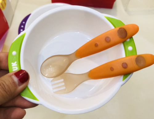 比如饭盒,我买的是一整套NUK的儿童碗筷,材质比较好,都是食品级别的,给小丫头用放心。收纳什么的也很方便,而且很轻便,塞在书包里基本没什么重量,还是卡通图案的哦。