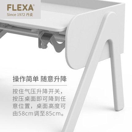 浏览购物网站可以发现,大部分可调式儿童桌的最低高度约为54厘米,最高高度为78厘米,平均可调范围为24厘米,主要可调范围集中在64~79厘米之间。而FLEXA-WOODY系列学习桌的最高调节位置达到了85cm。通常儿童桌的高度升降方式可分为手摇式、气压升降、孔位式手拉升降和机械式升降四种。FLEXA-WOODY系列学习桌采用操作简单的气压升降方式,按压桌面即可升降到任意位置,桌面高度的调解范围在58cm至85cm之间,可满足孩子从3岁起一直到成年的使用需求。