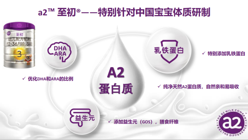a2至初奶粉富含A2型蛋白质,是一种自然亲和,更容易被宝宝吸收的营养物质,贴合宝宝的肠道需求,有助于帮助宝宝身体茁壮成长。除了A2蛋白质,a2至初奶粉还优化了DHA和ARA比例,帮助婴幼儿视力正常发育。另外,它还特别添加了乳铁蛋白呢。优质的营养成分让宝贝身体健康,吃嘛嘛香,身体倍儿棒~