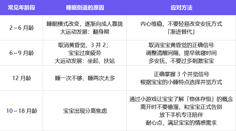 常见月龄:6~9月龄黄昏觉消失的3并2阶段(3觉并2觉)、12月龄白天第二次小睡哄睡困难时期。