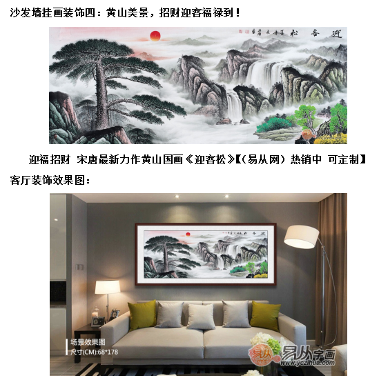 而黄山迎客松有招财迎客的含义,两根树枝伸出如同是伸出的双手迎接客人的到来,同时也只迎来财运的含义;右侧的高山雄伟壮阔,是靠山之意,无论是生活还是工作都有靠山支持;两条瀑布、河流是财富来源广阔财源不断的含义,远处红日高悬紫气东来称心如意。黄山《迎客松》山水画描绘了黄山美景,更有风水顺畅财运旺,挂在客厅装饰是经典的选择!