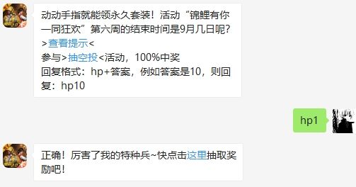 动动手指就能领永久套装!活动“锦鲤有你 一同狂欢”第六周的结束时间是9月几日呢?>查看提示<