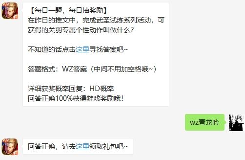 在昨日的推文中,完成武圣试炼系列活动,可获得的关羽专属个性动作叫做什么?