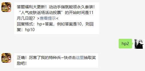 答题福利大更新!动动手指就能领永久套装!“人气皮肤返场活动投票”的开始时间是11月几日呢?>查看提示<