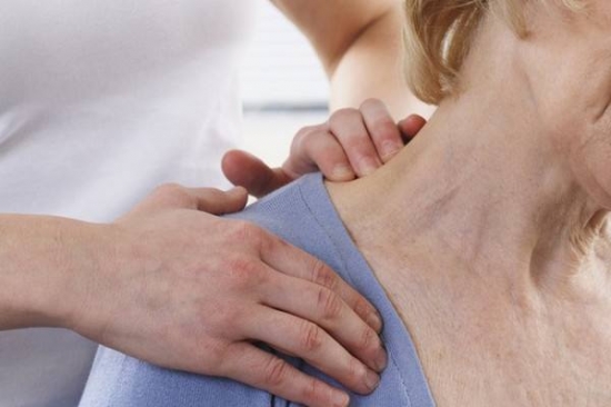 取坐位,以左手手掌贴于右肩,旋摩肩周50~100次,使之产生温热感,换手。