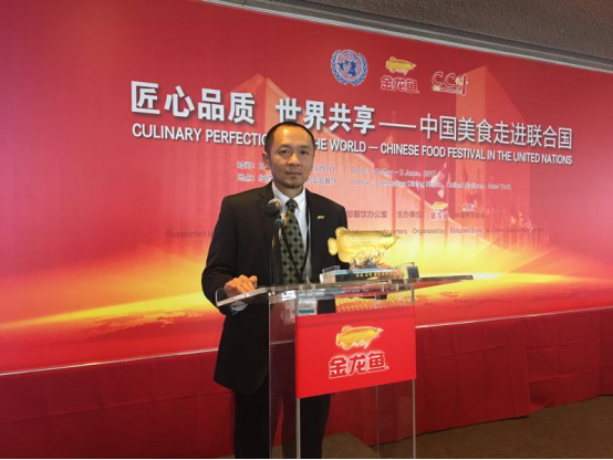 由联合国总部餐饮办公室支持、金龙鱼和中国烹饪协会主办的“中国美食走进联合国”首场活动“中国美食走进联合国午宴”在联合国总部餐饮办公室亮相。当晚,“匠心品质 世界共享 中国美食走进联合国”美食节开幕式暨高端品鉴晚宴盛大举行,中国驻纽约总领馆文化参赞李立言、西班牙驻联合国大使林纳雷斯(Juan Muanuel Fonxalex De Linares)、美国前总统尼克松的孙子考克斯(Chris Cox)及各国驻联合国大使以及纽约政商嘉宾近150多人与会。