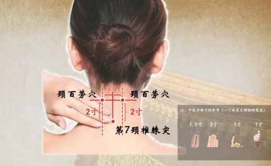 取穴法:正坐取穴。当我们低头时可在颈项部下面摸到有一高突的椎骨,用手按住并转动脖子则可感觉它也随之转动,该处就是第7颈椎棘突。以第7颈椎棘突为起点,上2寸(拇指背侧横纹为1寸),后正中线旁开1寸(同前)则为颈百劳穴。