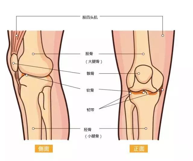 膝关节是由大腿骨、小腿骨和膝盖骨所组成,在大腿骨的终端和小腿骨的顶部及膝盖骨后面都有软骨包着,这软骨是有润滑作用的,其主要功能是帮助两骨终端的关节活动及减少因活动而产生之磨擦,再者软骨也能起吸收震荡及保护作用。为了协助及保持膝关节的正常运作,膝关节周围,还有纤组囊、韧带及肌肉去支持和操纵关节的活动,为了供应关节的营养,尤其是软骨,整个关节腔都是被滑膜包着,滑膜能产生润滑液,以提供营养给关节,并能润滑关节内各处的磨损面。