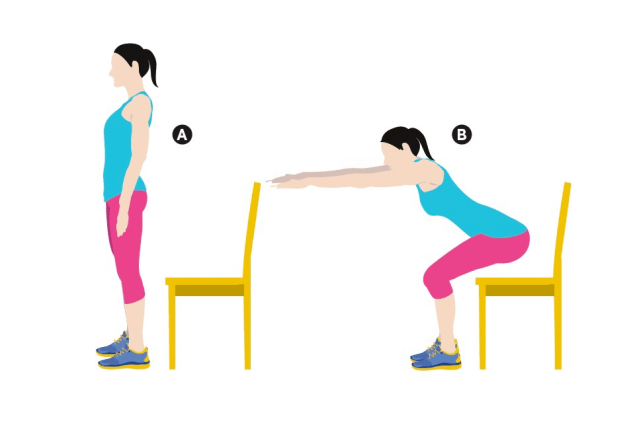 蹲坐 双脚分开站立在椅子前,双臂向前伸展,然后臀部向后下蹲,想象你的屁股后面有个凳子,要坐上去。