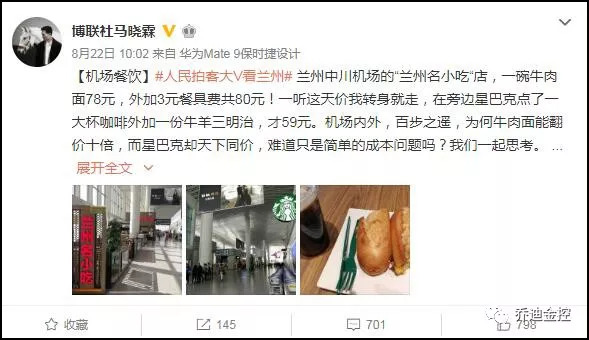兰州中川机场通报,感谢旅客和社会各界对兰州机场服务工作的关注和监督。关于某微博用户发文及部分网络媒体转发“兰州中川机场某餐厅牛肉面价格偏高”事宜,兰州机场高度关注,第一时间与机场“兰州名小吃”餐厅进行核实,基本情况如下:该餐厅牛肉面明码标价,有38元、78元价格不等的牛肉面套餐,供旅客自主选择。其中,78元套餐由1碗牛肉面、1份牛肉、1个鸡蛋、1份凉拌鸡胗、1份凉拌时蔬组成,另赠送1杯清凉饮料;餐具包括免费消毒筷或2元的一次性餐具包,可自主选择。同时,机场范围内不同位置还有12元的单碗牛肉面,以及28元、38元、48元、58元等牛肉面套餐销售。