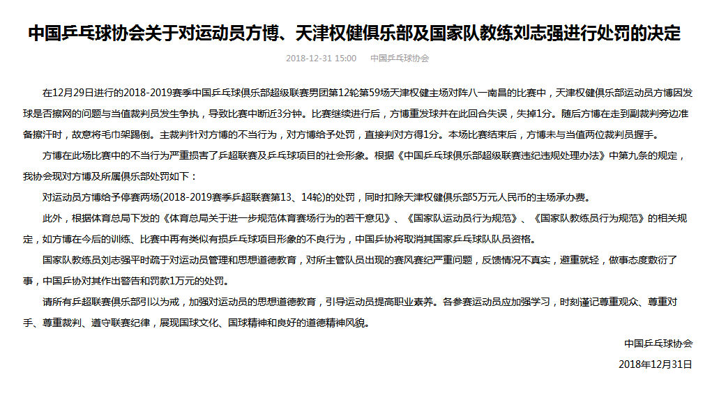 12月29日,乒超联赛第12轮,天津权健对阵八一南昌,国乒球员方博代表权健出战,因为发球是否擦网的问题,方博与裁判起了争执,比赛一度中断3分钟!随后,方博重新发球,但输掉了这一分,方博当场发飙,他走到副裁判身边擦汗,故意一脚踢倒了毛巾架。