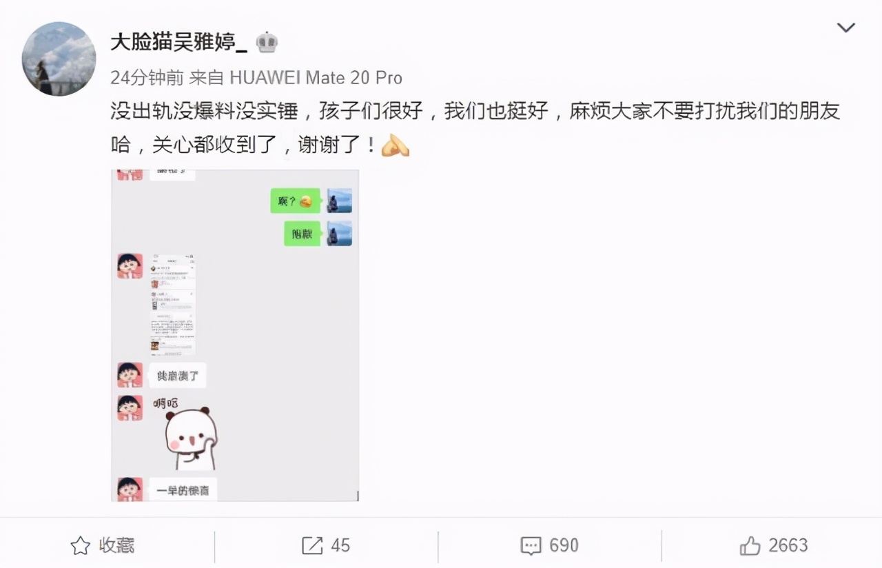 没有出轨、没有爆料、没有实锤。我们都很好,孩子也很好,希望不要打扰我们的朋友。