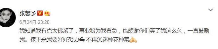 昨晚,张馨予发出一段文字,和粉丝互动:“我知道我有点太佛系了,事业粉为我着急,也感谢你们等了我这么久,一直鼓励我。接下来我要好好努力,不再沉迷种花种菜。”女神为何深夜发出如此感慨,原来是看了很多粉丝发给她的私信,反思了一下……
