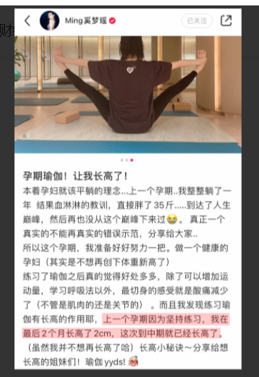 7月29日,超模孕妈奚梦瑶分享了自己在孕期中的瑜伽经验帖。她在帖子中谈到,怀第一胎时“本着孕妇就该平躺的理念”,结果胖了35斤,到达人生巅峰后就再也没下来过了,所以第二个孕期准备自己努力一把,练了瑜伽,她称最切身的感受是酸痛减少了,而且意外长高2厘米。