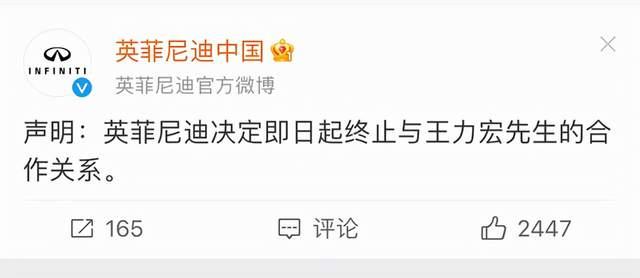 英菲尼迪官方微博发文,决定即日起终止与王力宏先生的合作关系。