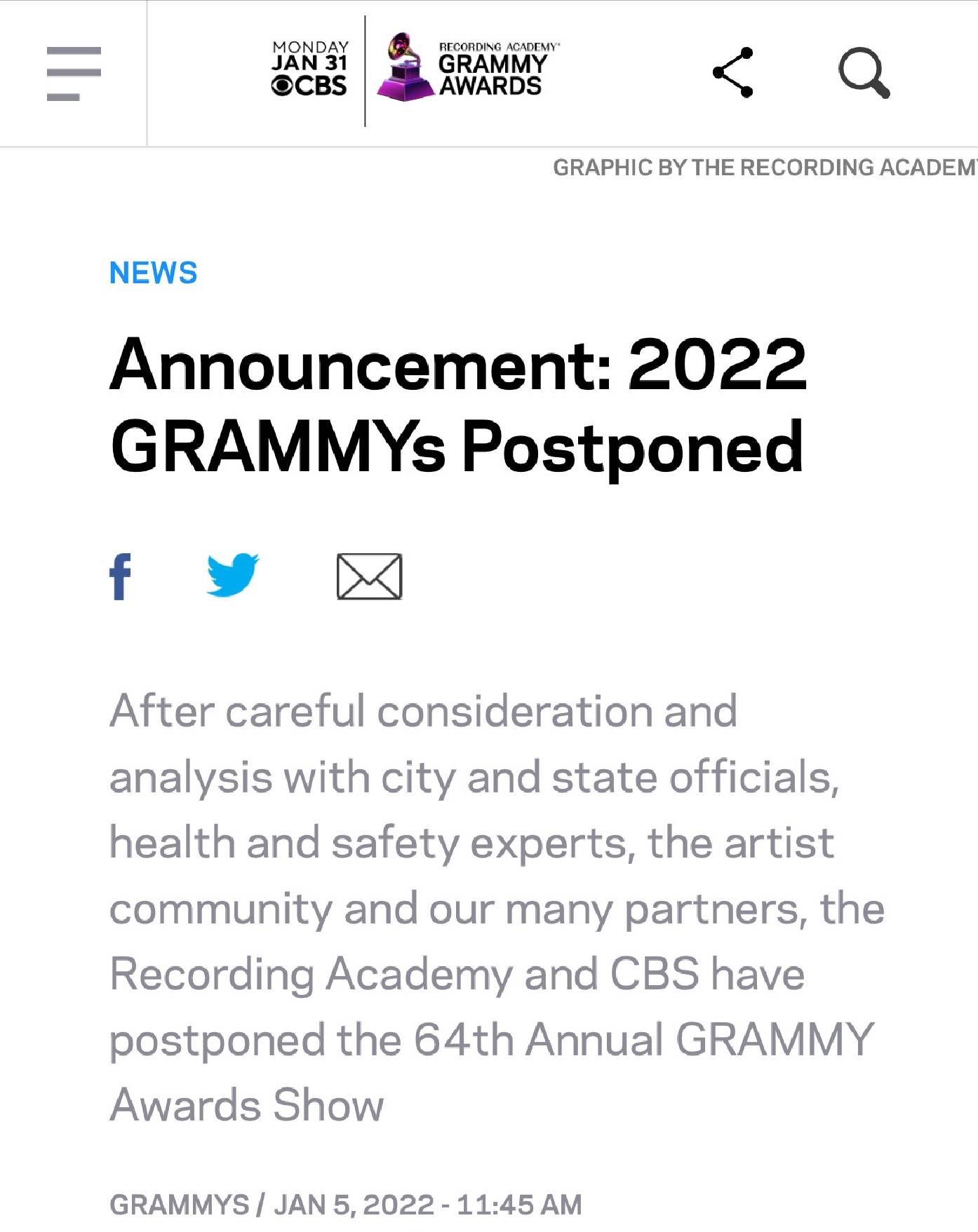 声明中表示“经过深思熟虑和分析,推迟了第64届年度会议格莱美颁奖典礼。”