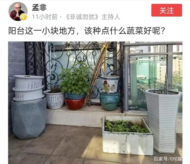 在上海居住的知名节目主持人孟非也分享起了居家日常,无法外出买菜的他,打起了阳台的主意,准备在阳台上种一些蔬菜,不知道种什么的他,主动寻求其网友的意见。