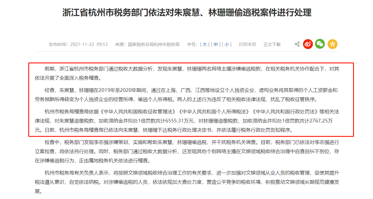 去年11月,杭州市税务局稽查局官网发文称,发现朱宸慧、林珊珊两名网络主播涉嫌偷逃税款,对朱宸慧追缴税款、加收滞纳金并拟处1倍罚款共计6555.31万元,对林珊珊追缴税款、加收滞纳金并拟处1倍罚款共计2767.25万元。