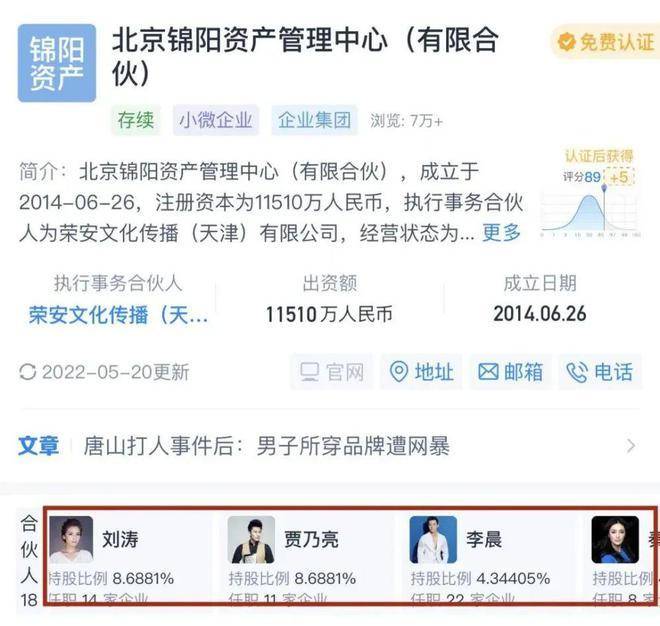 在存续的企业中,除了2家个人工作室外,海口漫川文化传媒有限公司、海南六月天贸易有限公司、博学思行(北京)教育科技有限公司为贾乃亮与姐姐贾珊关联公司,两人共同持股并分别担任监事、执行董事兼总经理职位;北京锦阳资产管理中心(有限合伙)的股东还包括刘涛、李晨、秦岚、马苏及陈赫、倪妮个人工作室等。