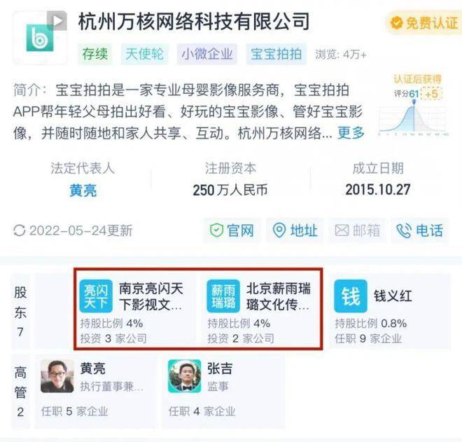 企查查APP显示,杭州万核于2015年10月成立,实缴资本75万元。贾乃亮全资持股的南京亮闪天下影视文化工作室认缴出资10万元,占股4%,除此之外李小璐全资持股的北京薪雨瑞璐文化传播工作室同样出资10万元,也占股4%。