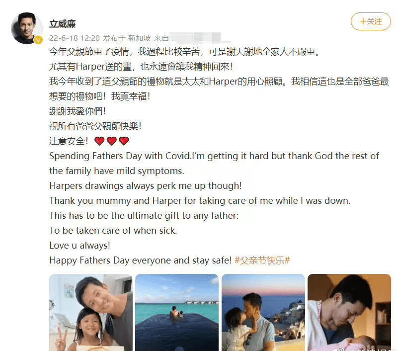 6月18日,立威廉晒出与女儿的合照,并透露自己感染了新冠,说实话,这并不是一件值得开心的事情!