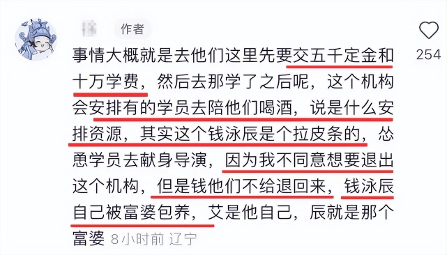 这个爆料经过传播发酵后,在网络上引起了很多舆论,因为此前钱泳辰就与何艾传出过绯闻,曾高调为其庆生,发过一些暧昧的动态,所以该学员爆料后很多网友选择相信了,眼看着钱泳辰的口碑即将崩塌,培训机构的老师接受采访正面做出了回应。