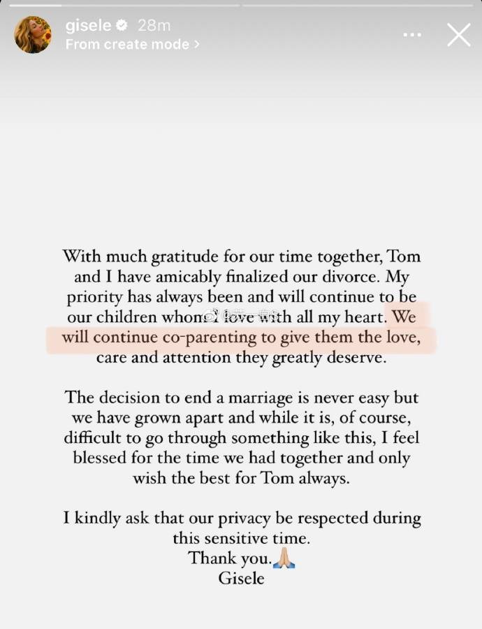 吉赛尔·邦辰在文中感激汤姆·布拉迪友好地完成离婚,两人将共同抚养小孩,离婚不是一件容易的事,她为曾经在一起感到幸福,只希望汤姆永远快乐。