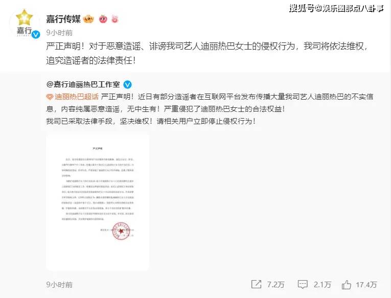 3日晚间快到11点,嘉行迪丽热巴工作室发声明回应,“部分互联网用户发布、传播关于迪丽热巴的不实信息,内容纯属恶意造谣,无中生有,严重侵犯了迪丽热巴的名誉权。”
